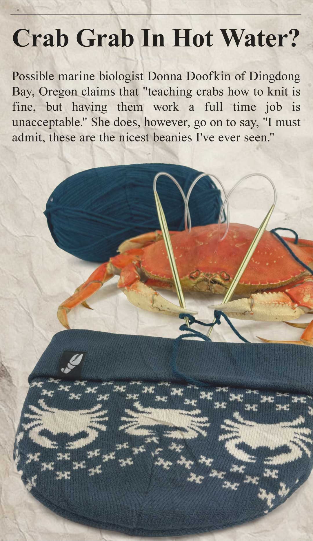 The legendary beanie that got Crab Grab in trouble with Donna Doofkin, possible marine biologist. Please see news story down below.